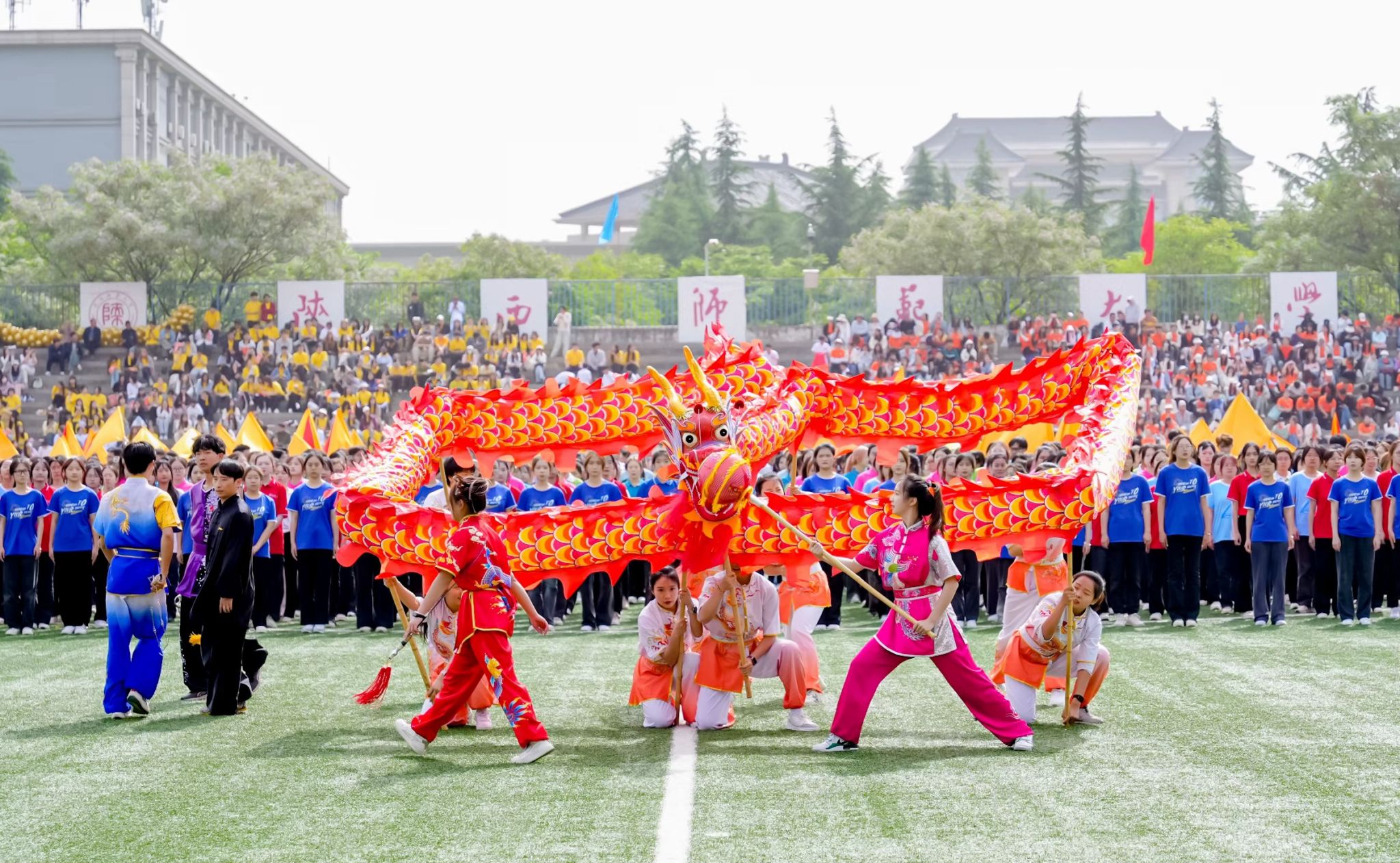 龙狮俱乐部学子在校运动会开幕式上表演舞龙