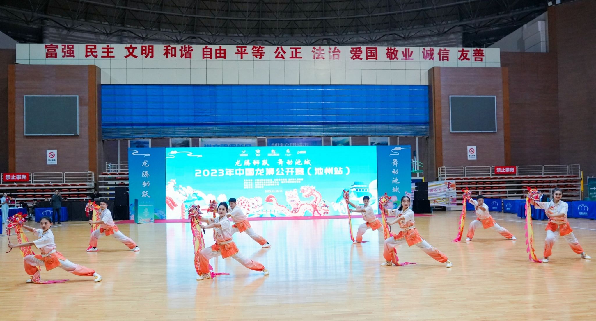 赛台之上,龙腾起舞,云翻乾坤,队员们精神抖擞、器宇轩昂,动作行云流水、刚柔并济。一曲终了,静默片刻后,观众席响起雷鸣般的掌声。