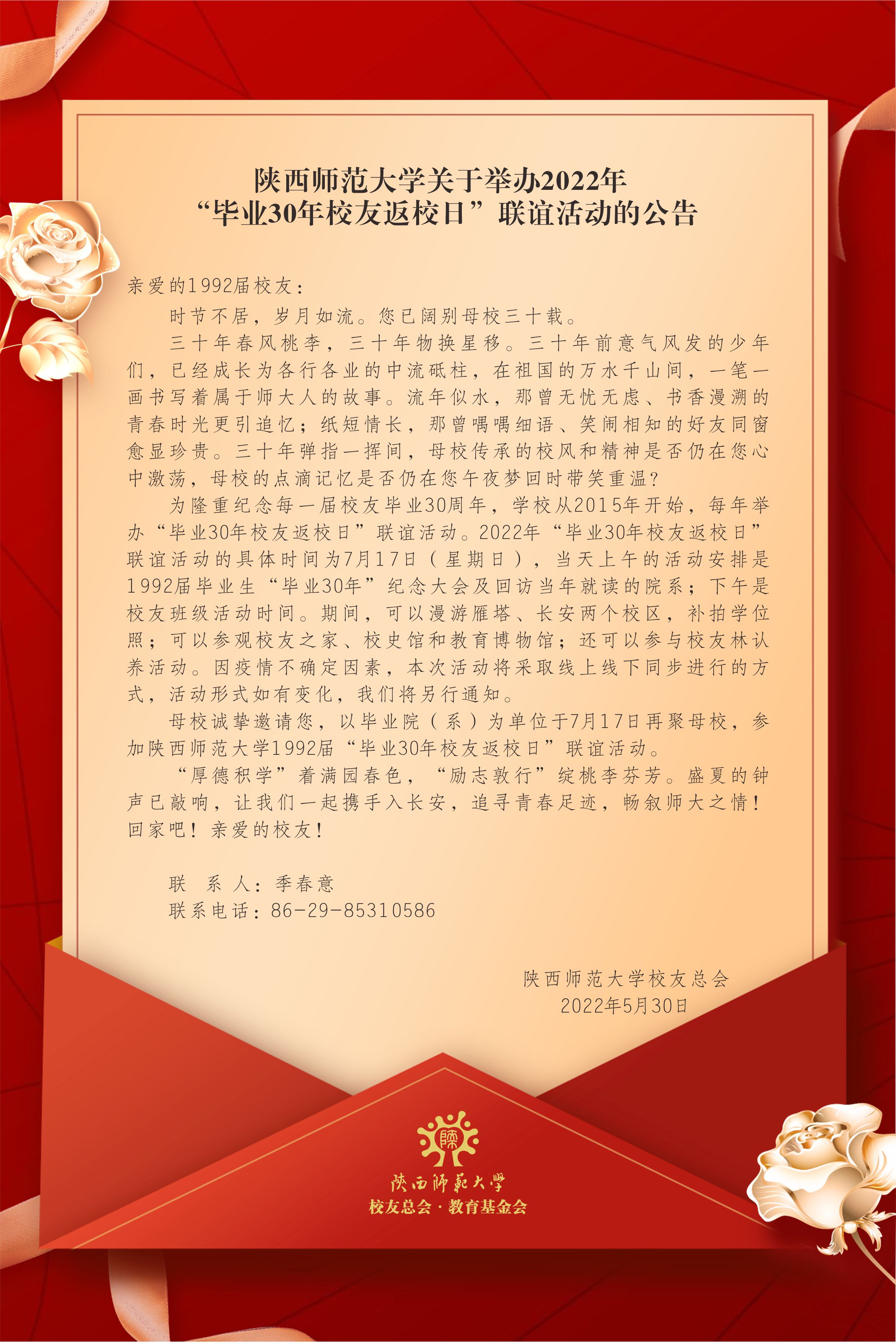 德赢AC米兰中国官方网站关于举办2022年“毕业30年校友返校日”联谊活动的公告