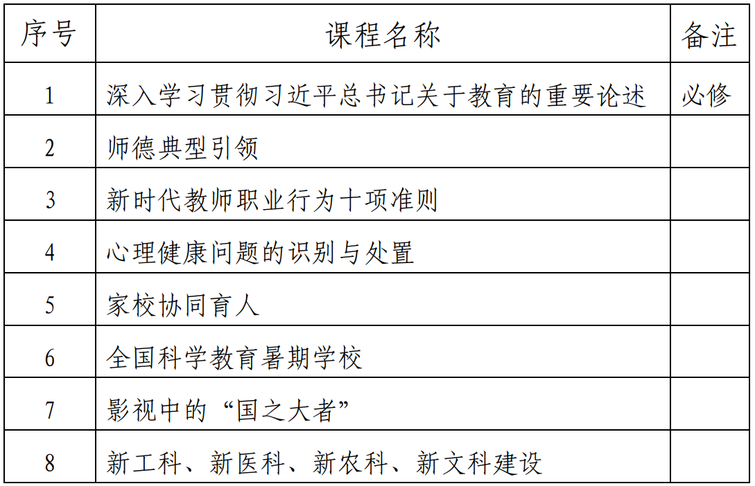 2022年暑期教师研修共设有8门课,每门课有若干学习资源,除了第1门课《深入学习贯彻习近平总书记关于教育的重要论述》为必修课程,其余均为选修课程,教师可根据需要从各门课程中自主选择学习。具体课程安排见下表: