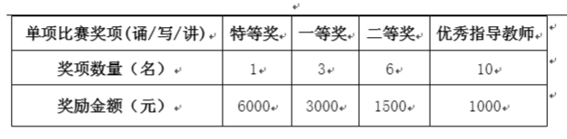 大赛各赛事设特等奖1名、一等奖3名、二等奖6名、优秀奖、优秀组织单位若干及优秀指导教师10名。奖励金额如下: