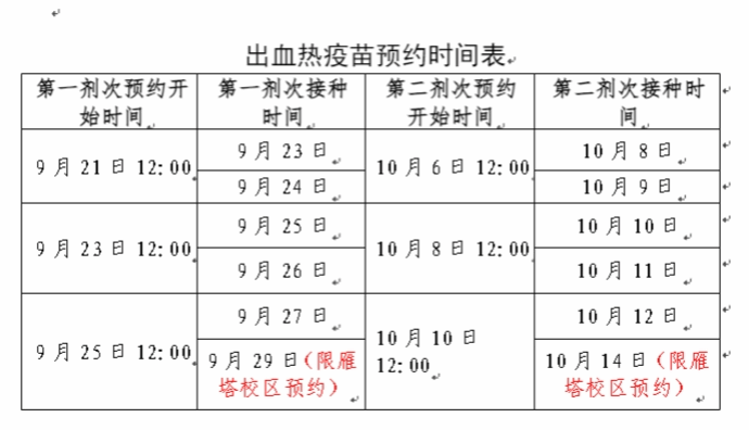基础第一剂次:9月23日-9月27日,9月29日;上午08:30-11:30,下午14:30-17:00。