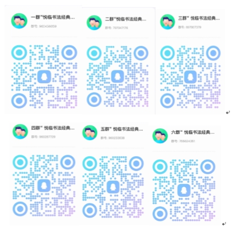 (1)请参与“悦临书法经典,卌载砚友传承”临摹打卡活动学分认证组的学生最晚于7月18日(含)前加入活动QQ群,二维码如下(选择一个群加入即可):