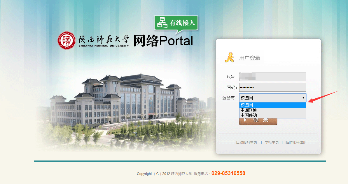 3.账号绑定完成,在网络认证登录界面,选择相应的运营商(校园网、中国联通、中国移动),并使用校园网上网账号及密码进行登录,如下图所示。
