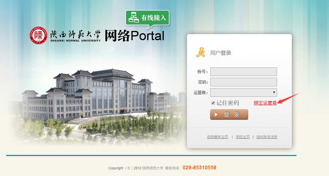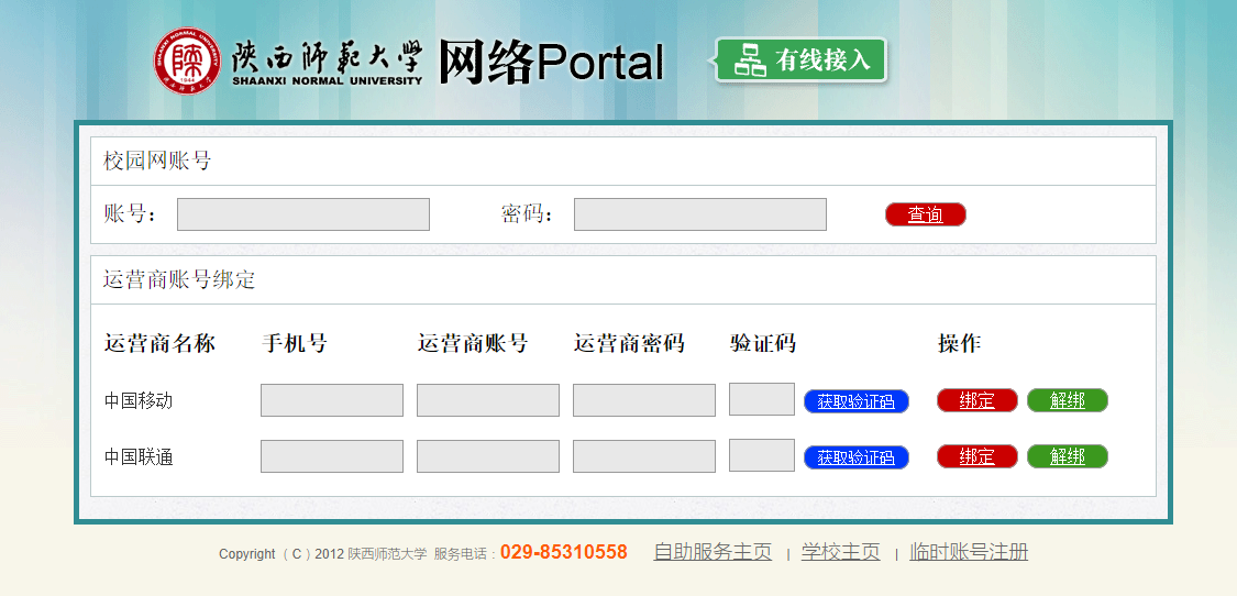 2.首次登录网络时,在认证登录页面(http://net.snnu.edu.cn)将网络运营商“代拨”账号与校园网的上网账号进行绑定,具体操作为,在校园网网络认证登录界面,点击“绑定运营商”,填写校园网账号、密码及相应网络运营商的“代拨”账号、密码及个人手机号进行绑定,如下图所示。