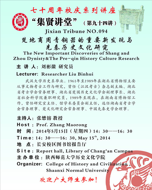 讲座题目:校庆七十周年系列之集贤讲堂:楚地商周青铜器的重要新发现与先秦历史文化研究