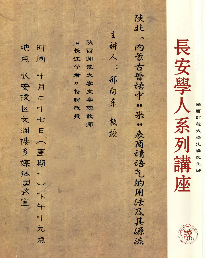 讲座题目:长安学人系列讲座:陕北、内蒙古晋语中“来”表商请语气的用法及其源流