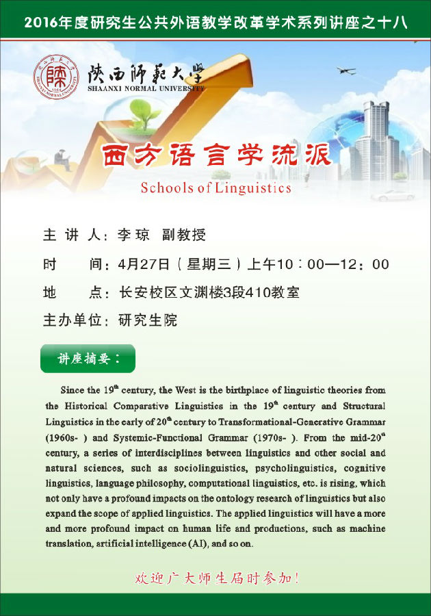 讲座题目:2016年度研究生公共外语教学改革学术系列讲座之十八:西方语言学流派