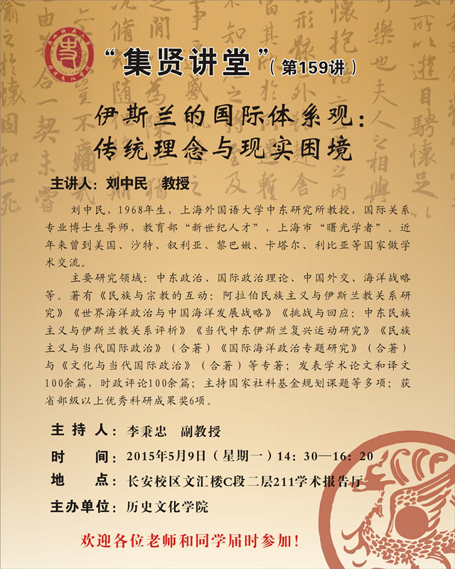 讲座题目:集贤讲堂第159讲:伊斯兰的国际体系观:传统理念与现实困境