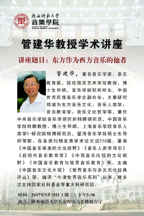 讲座人简介:管建华,著名音乐学家、音乐教育家。现任南京艺术学院教授,博士生导师,音乐学研究所所长,中国世界民族音乐学会副会长。主要研究领域为东方音乐文化、音乐人类学、音乐教育学、音乐文化哲学等。兼任中央音乐学院音乐学研究所特聘研究员,中国音乐学院特聘教授、博士生导师,上海音乐学院音乐人类学E-研究院特聘研究员,星海音乐学院硕士生导师等职。著有《中国音乐审美的文化视野》《音乐人类学导引》《后现代音乐教育学》《中西音乐比较的文化视野》《中国音乐教育与世界音乐教育》等。主编《中国音乐文化大观》《世界音乐与多元文化经典译丛》等,编译“牛津世界音乐系列”丛书。多次主持国家社科基金等重大科研项目。
