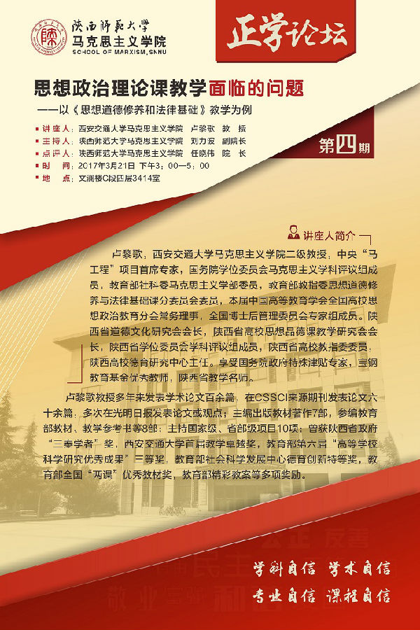 讲座题目:正学论坛第四期:思想政治理论课教学面临的问题——以《思想道德修养和法律基础》教学为例