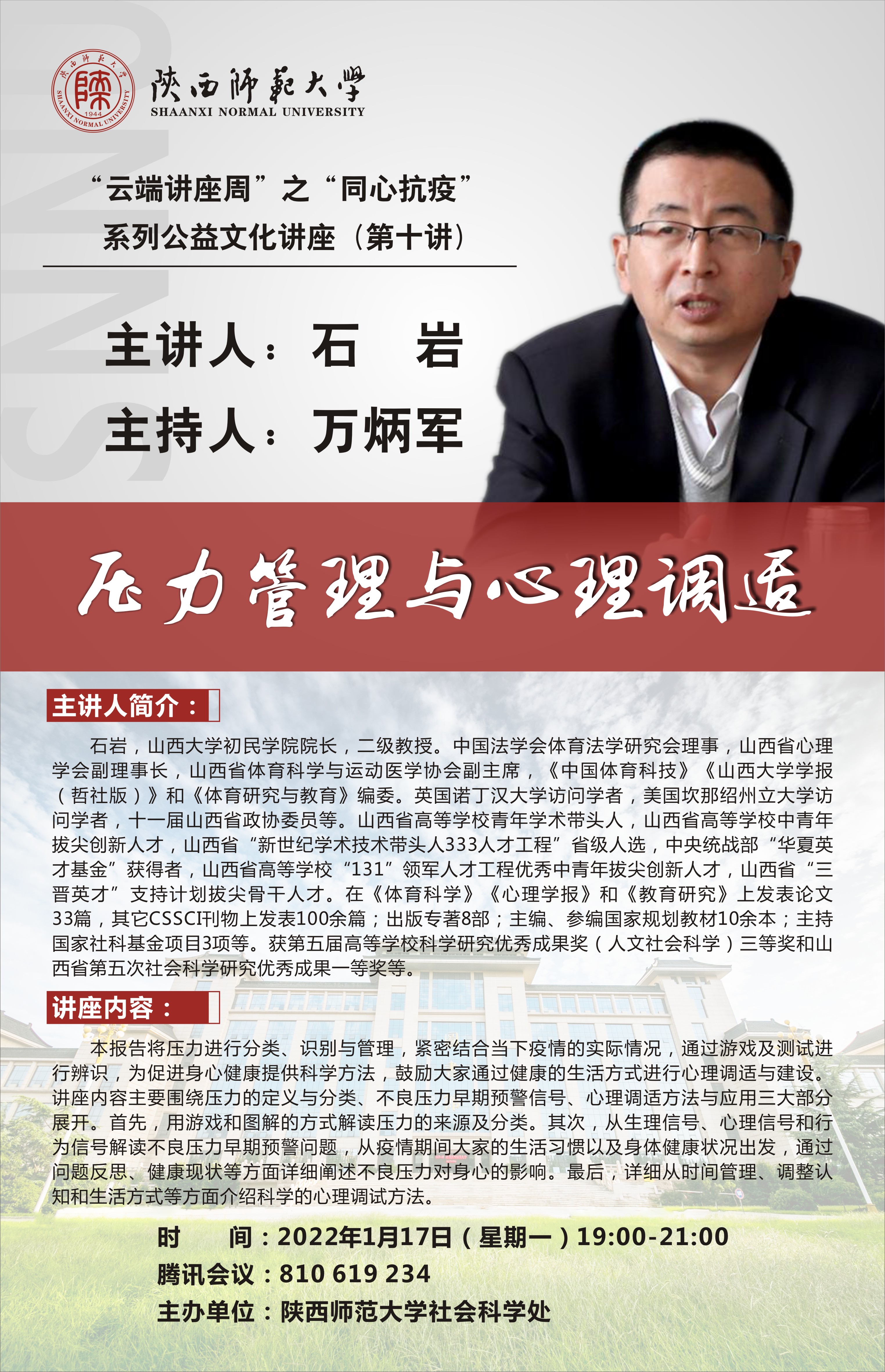 “云端讲座周”之“同心抗疫”系列公益文化讲座(第十讲):压力管理与心理调适