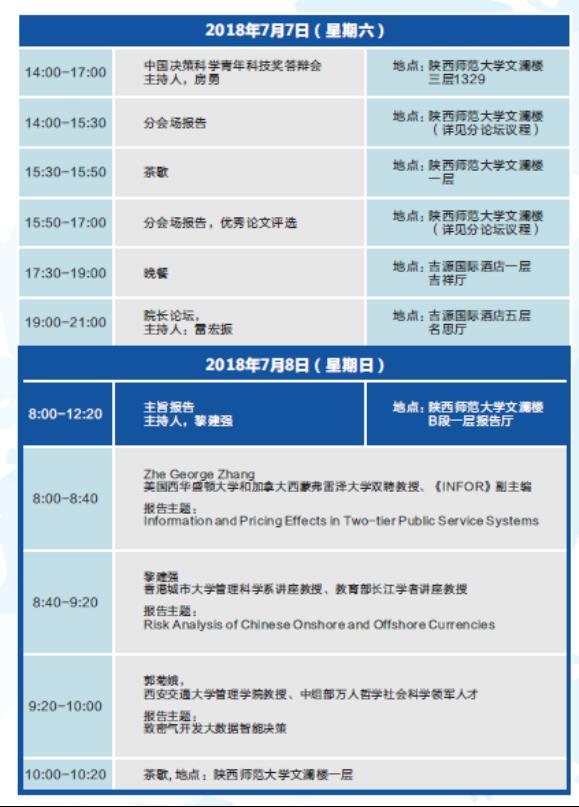 中国运筹学会决策科学分会学术年会暨行为经济与管理国际论坛于2018年7月6-8日在西安举办。会议的主要目的是交流决策科学各分支领域以及行为经济与管理领域的最新学术进展,促进跨学科方向的融合,探讨前沿性科研问题,展示我国决策科学相关领域的理论和方法的研究及应用推广的最新成果,同时也是来自全国各地决策科学分会理事和学者的一次难得聚会。
