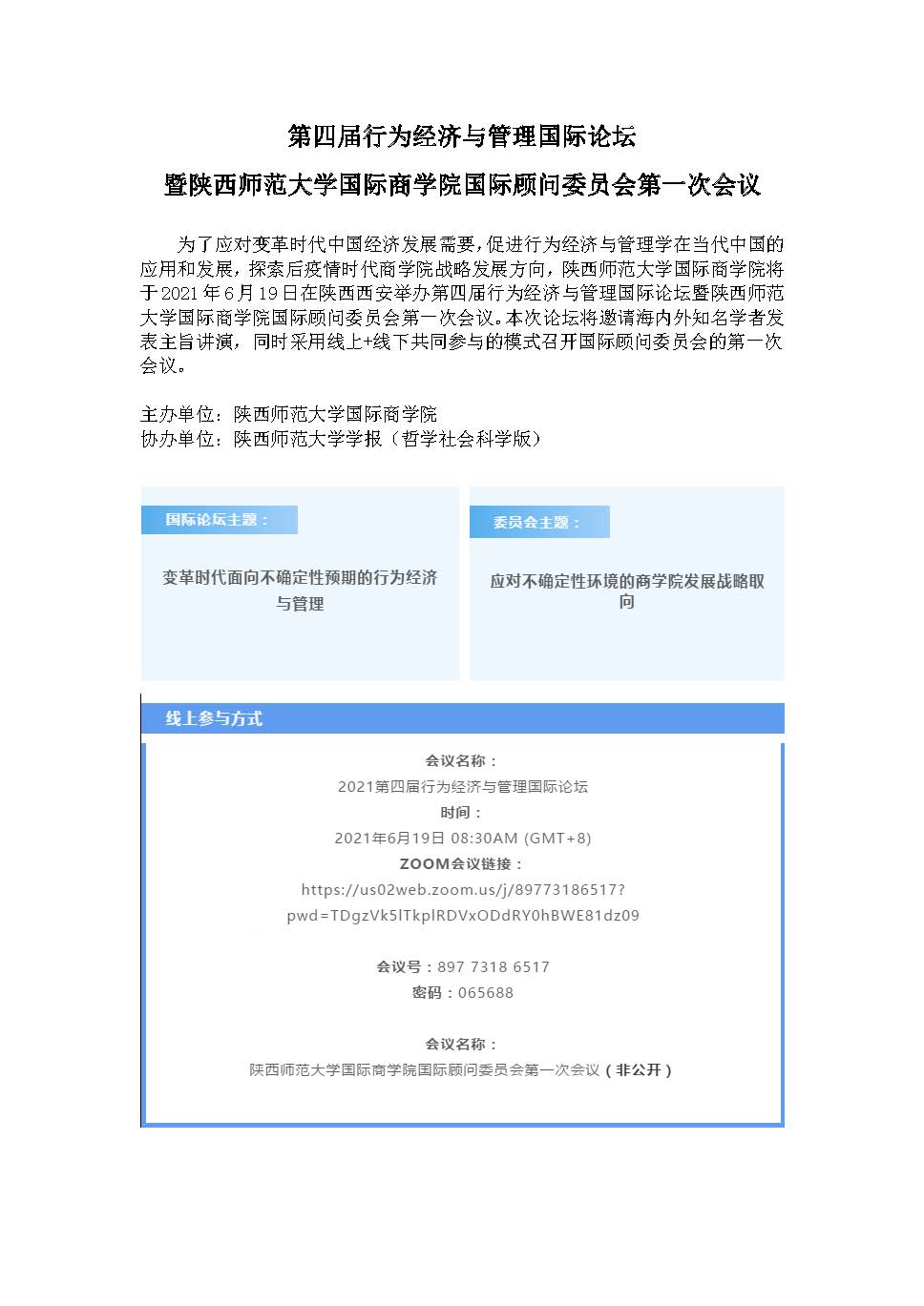 第四届行为经济与管理国际论坛暨德赢AC米兰中国官方网站国际商学院国际顾问委员会第一次会议