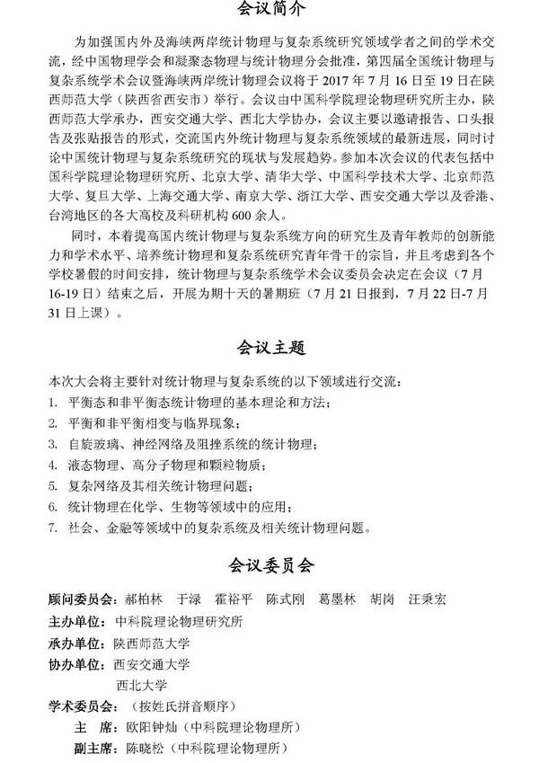 活动类别:第四届全国统计物理与复杂系统学术会议暨海峡两岸统计物理会议