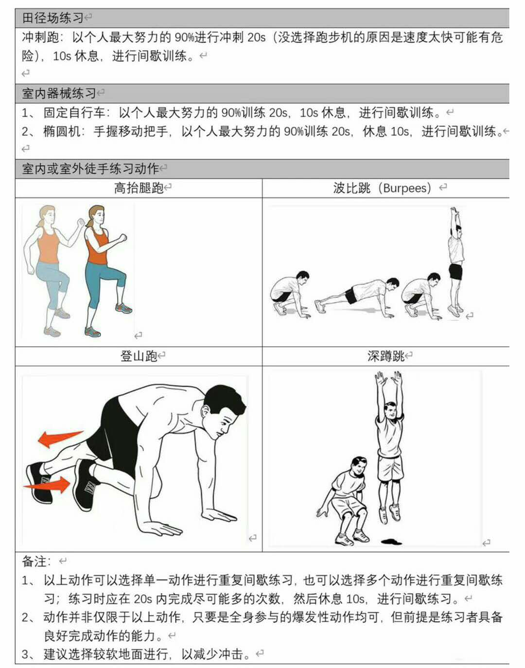2.确保训练效果的关键是运动强度,170%最大摄氧量的强度不在实验室条件下很难精确测量,因此可以将训练到第6组时达到最大心率(220-年龄) 的90%作为强度的参考值。没有锻炼经验的训练者,初期可将第6组时达到最大心率的70%作为参考值进行适应性训练,慢慢的可将强度逐步提升到最大心率的80%,这些强度同样会有不错的训练效果,同时能让锻炼者更好的进行适应。