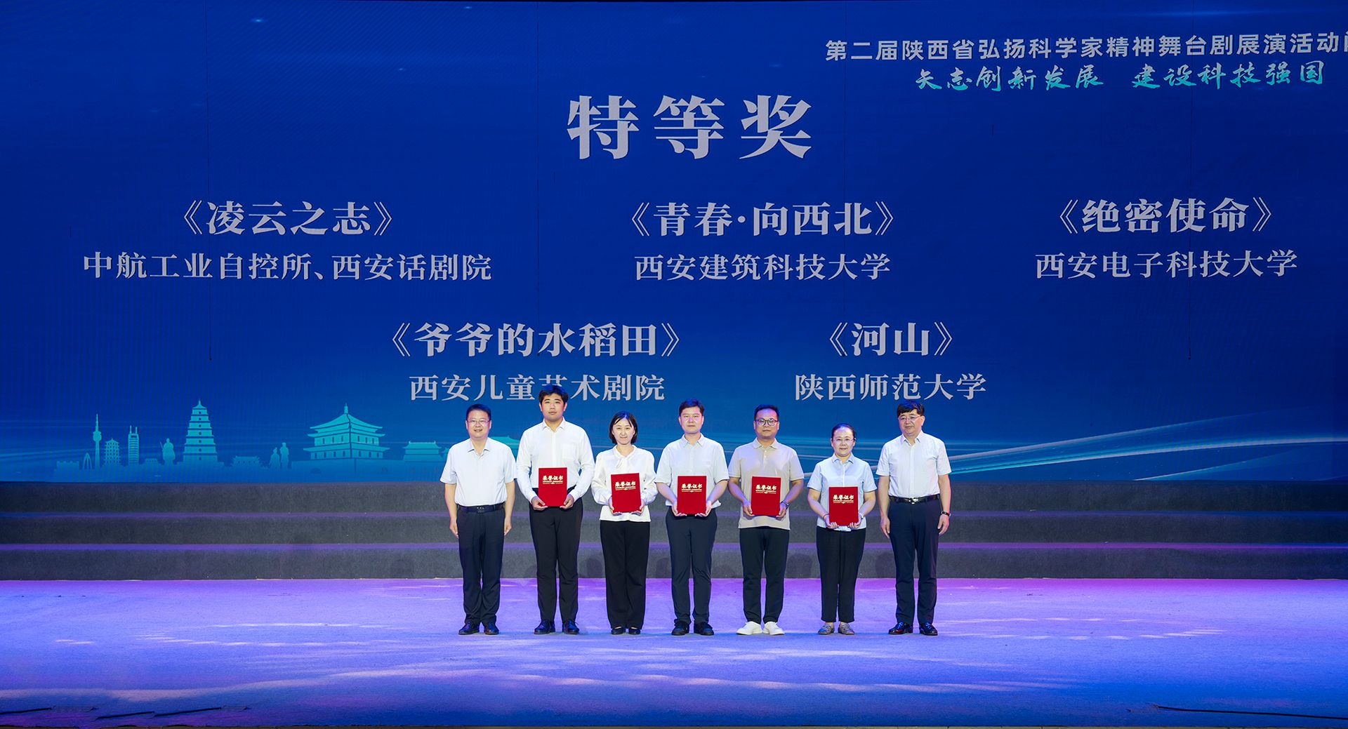 师大新闻网讯 6月11日,第二届陕西省弘扬科学家精神舞台剧展演活动落下帷幕,德赢官网原创“大先生”话剧《河山》荣获特等奖。本次活动由陕西省科协、省教育厅、省科技厅、团省委、省科学院主办,旨在进一步培育创新文化、弘扬科学家精神、涵养优良学风、营造创新氛围,共有16家单位报送的21部剧目参加展演,评选出特等奖5项。