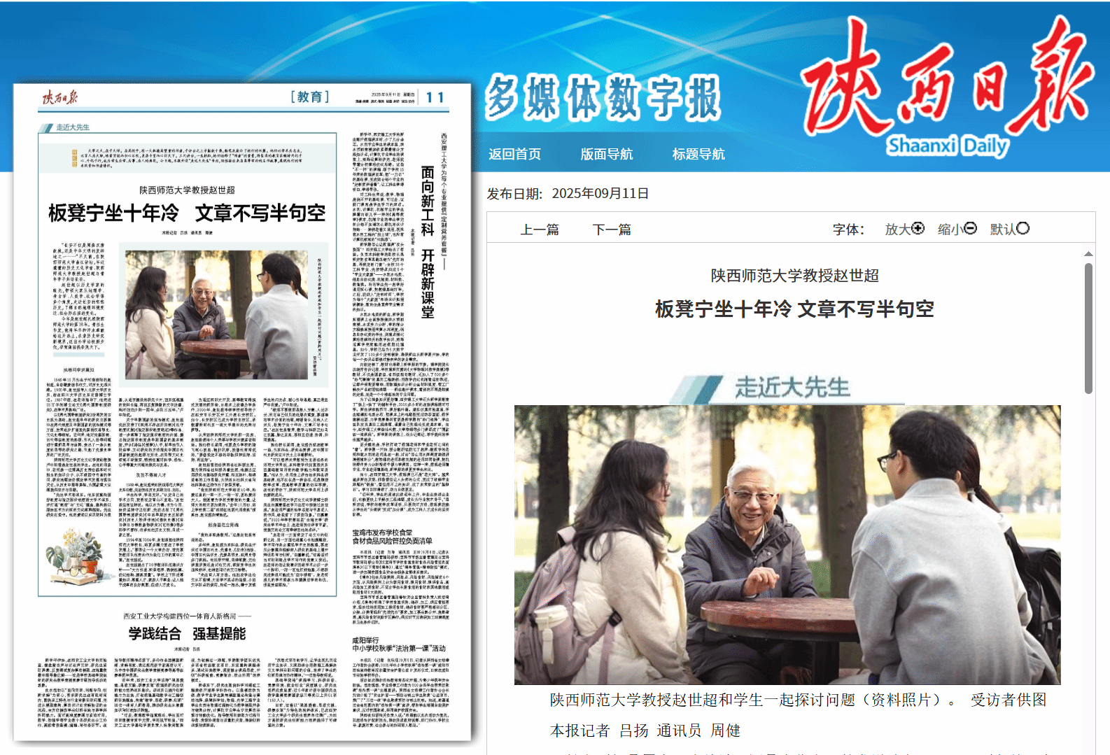 师大新闻网讯 9月11日,《陕西日报》在第11版“走近大先生”栏目,刊登人物通讯“德赢AC米兰中国官方网站教授赵世超:板凳宁坐十年冷 文章不写半句空”,讲述德赢官网历史文化学院赵世超教授38载扎根师大沃土,潜心治学、办学治校、教学育人的生动故事,彰显了他执卷问学求真知、孜孜不倦育人才、躬身垂范立师魂的大先生风范。