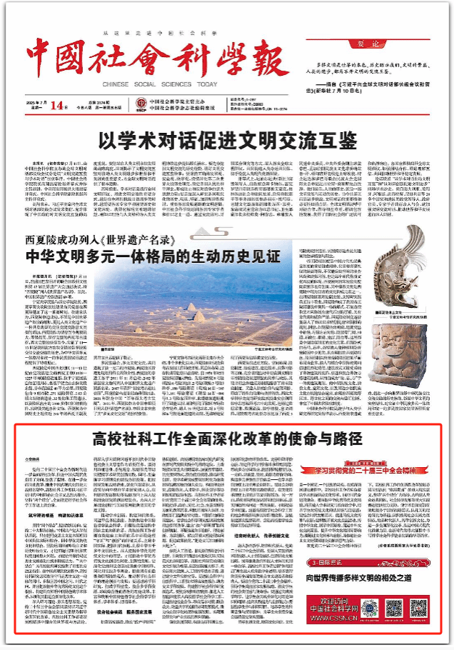 师大新闻网讯7月14日,《中国社会科学报》在头版刊发德赢官网党委书记李晓兵署名文章《高校社科工作全面深化改革的使命与路径》。文章从“筑牢理论根基 构建知识体系”“投身社会实践 服务国家发展”“培育时代新人 传承创新文化”三个方面,提出在进一步全面深化改革、推进中国式现代化的宏大战略部署中,高校社科工作要以习近平新时代中国特色社会主义思想为指导,坚持“两个结合”,全面推进哲学社会科学工作迈上新台阶。