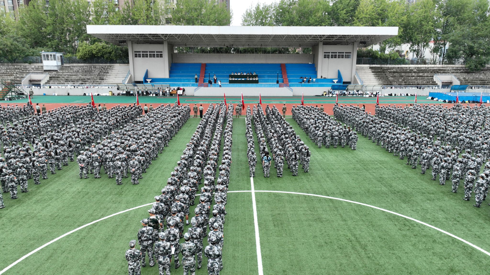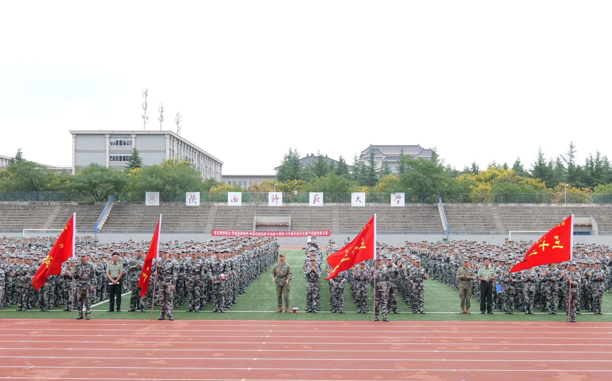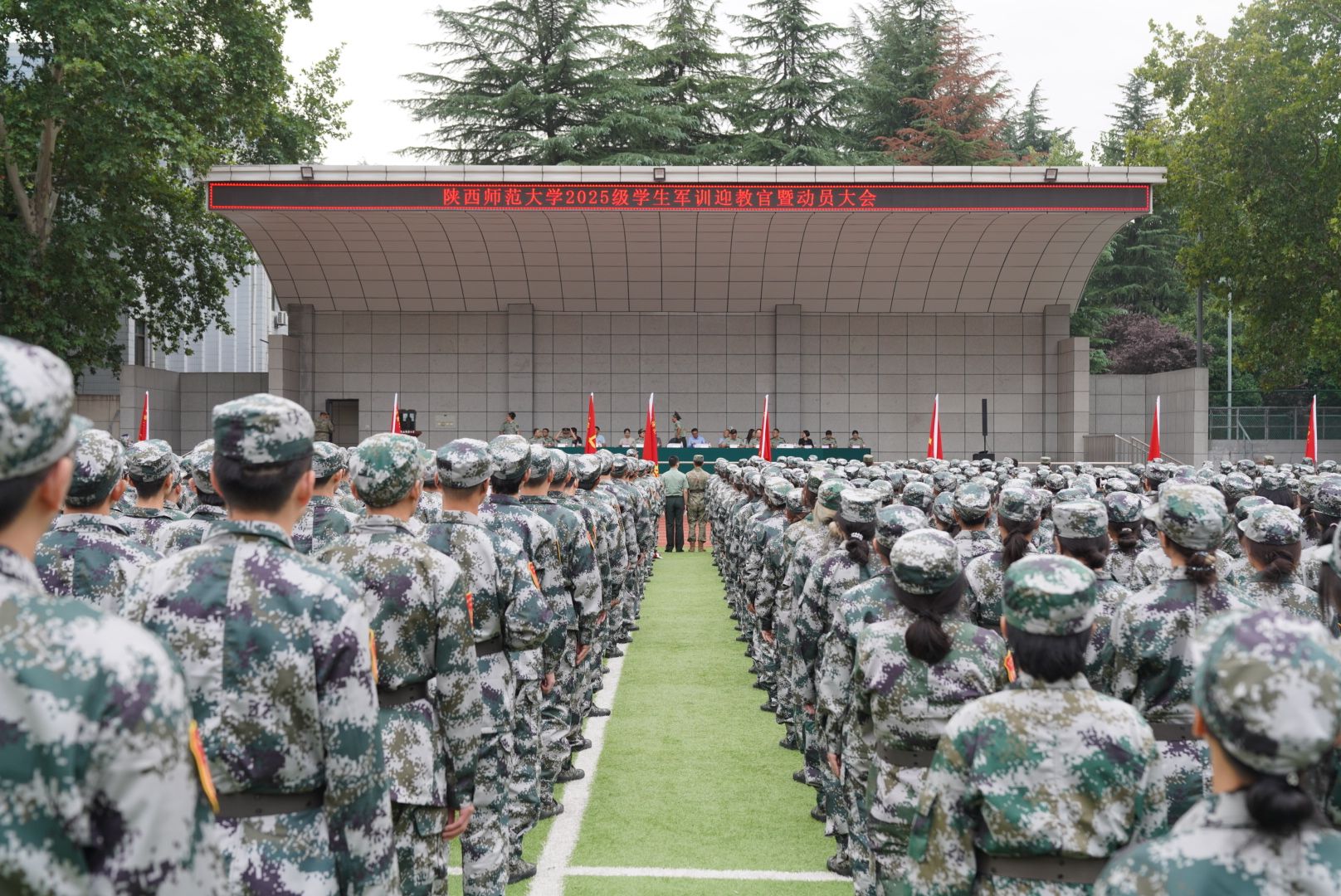 师大新闻网讯 青春正步走,启航新征程。9月3日下午,德赢官网2025级学生军训动员大会分别在长安、雁塔两校区田径场举行。校党委副书记罗永辉、副校长陈新兵,陆军边海防学院李玉红大校、刘法语大校等出席大会。