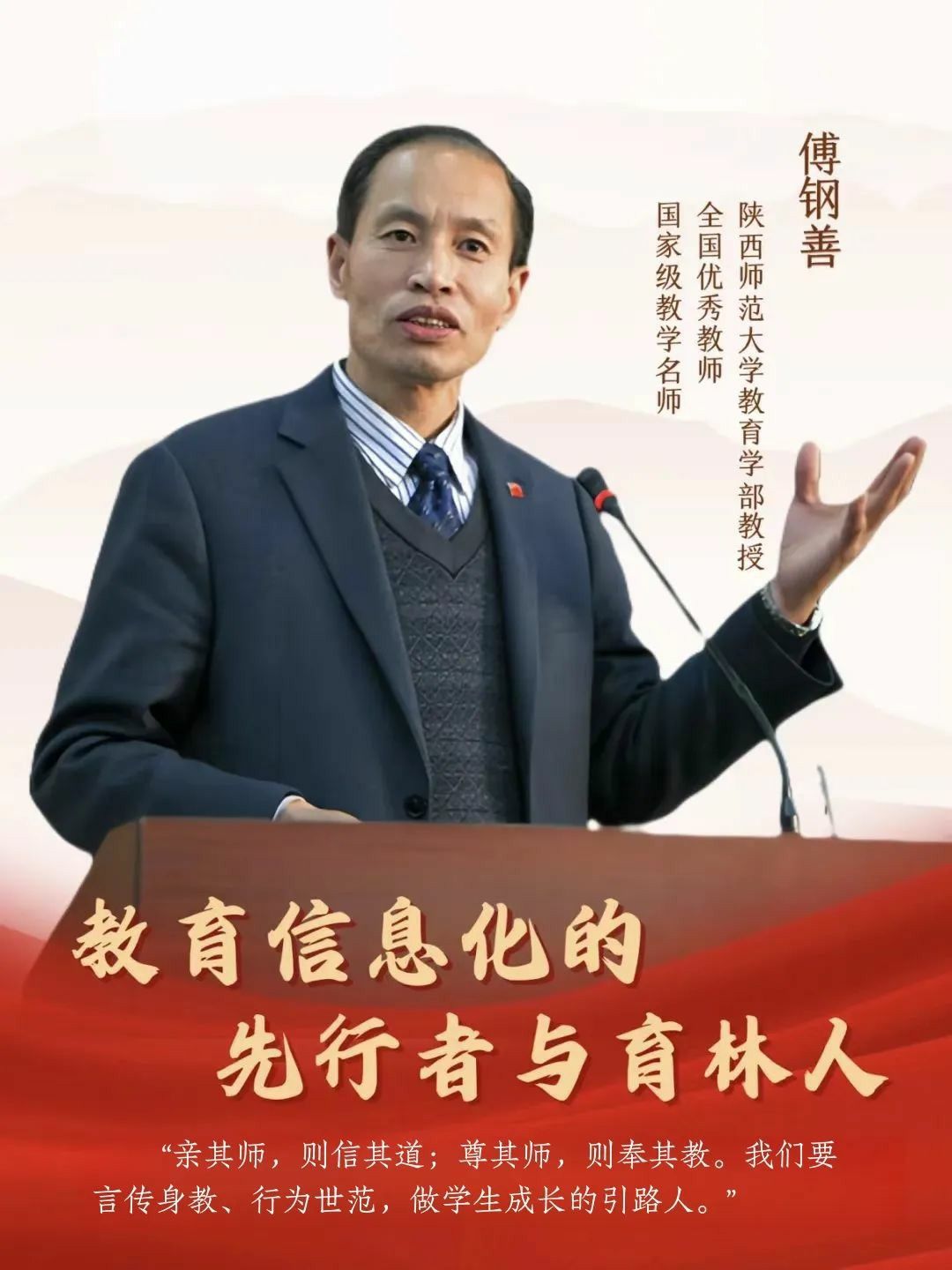 “‘亲其师,则信其道;尊其师,则奉其教。’我们要以言传身教、行为世范为道德情操,做学生成长的引路人。”40余年来,傅钢善躬耕教坛,探索创新,将丰富知识和育人智慧融入春风化雨的教书育人实践中,将“西部红烛两代师表”精神寓于一届届学生的言传身教中,以实际行动践行着新时代的教育家精神。