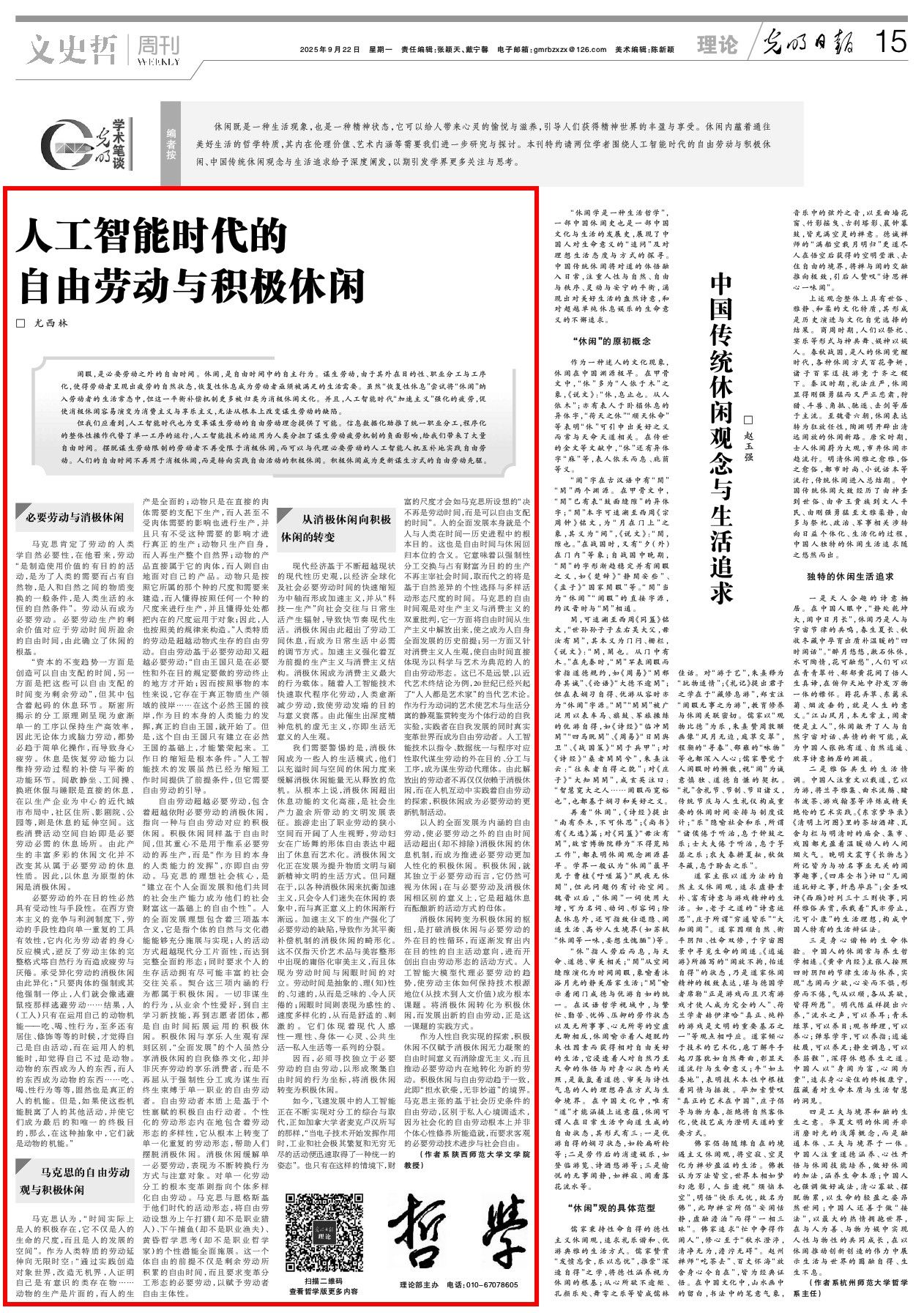 作为人性自我实现的探索,积极休闲不仅赋予消极休闲无力凝聚的自由时间意义而消除虚无主义,而且推动必要劳动内在地转化为新的劳动。积极休闲与自由劳动趋于一致,此即“担水砍柴,无非妙道”的境界。马克思主张的基于社会历史条件的自由劳动,区别于私人心境调适术,因为社会化的自由劳动根本上并非个体心性修养所能造就,而要求客观的必要劳动技术进步与社会自由。(作者:尤西林,系德赢AC米兰中国官方网站文学院教授)